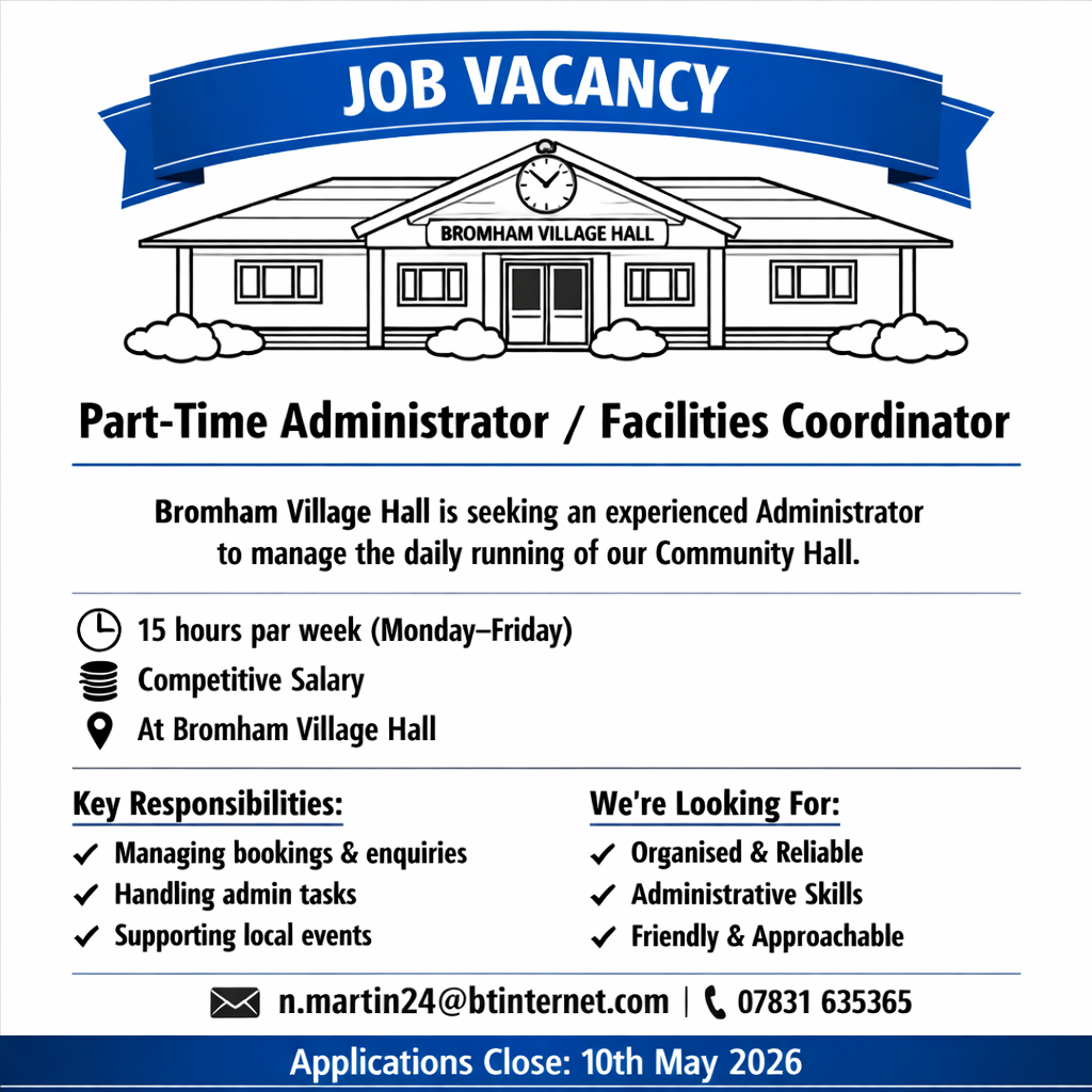 If you’re looking for a space to meet—either as a one‑off booking or on a regular basis—please email office@bromhamvillagehall.com with your enquiry. Our Administrator will respond as soon as possible during office opening hours.